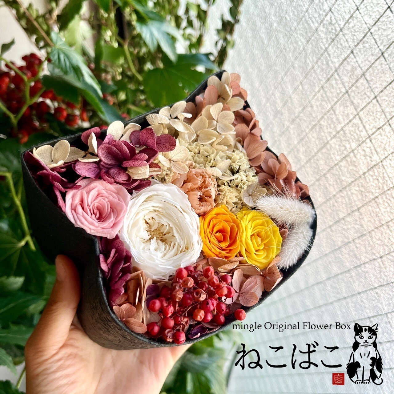 「ねこばこ~気まぐれの猫」シリーズは、通常ラインナップとは別に、フローリストがなんとなく"こんな色かわいいかも”と思って、文字通り“気まぐれ”で作ったねこばこ。